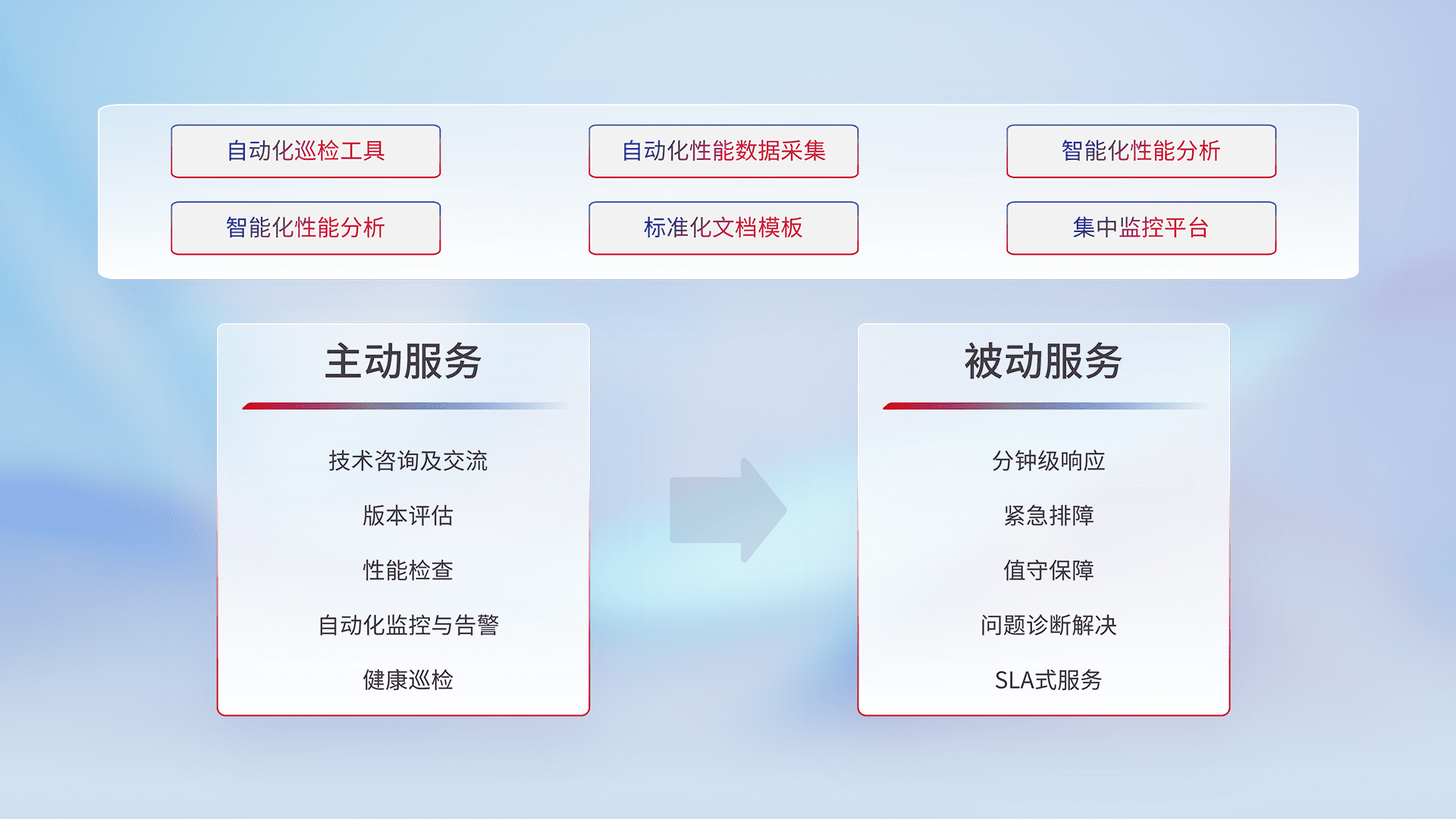 智能化工具和标准化文档,,,保障服务质量,,,,提供主动服务(包含技术咨询、、、、版本评估、、、、性能检查、、自动化监控与告警、、、健康巡检)和被动服务包含(分钟级响应、、紧急排障、、、值守保障、、问题诊断解决、、SLA服务)。。。。