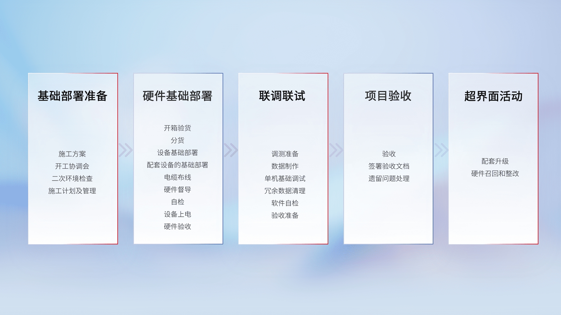 从基础部署准备、、、、硬件基础部署、、联调联试、、项目验收、、越界面活动的全过程可追溯,,保证施工质量和进度。。。